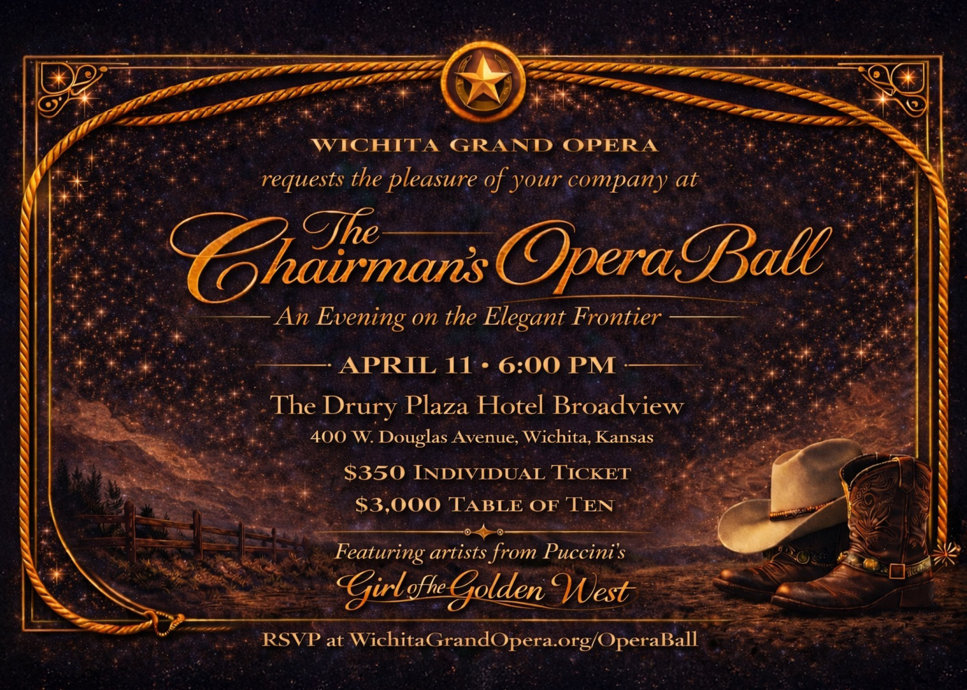 Join Wichita Grand Opera for our annual Chairman’s Opera Ball, an elegant celebration on the frontier. Set against the refined backdrop of the Drury Plaza Hotel Broadview, this cowboy-themed black-tie gala marks the kickoff to an exciting week of opera ahead.